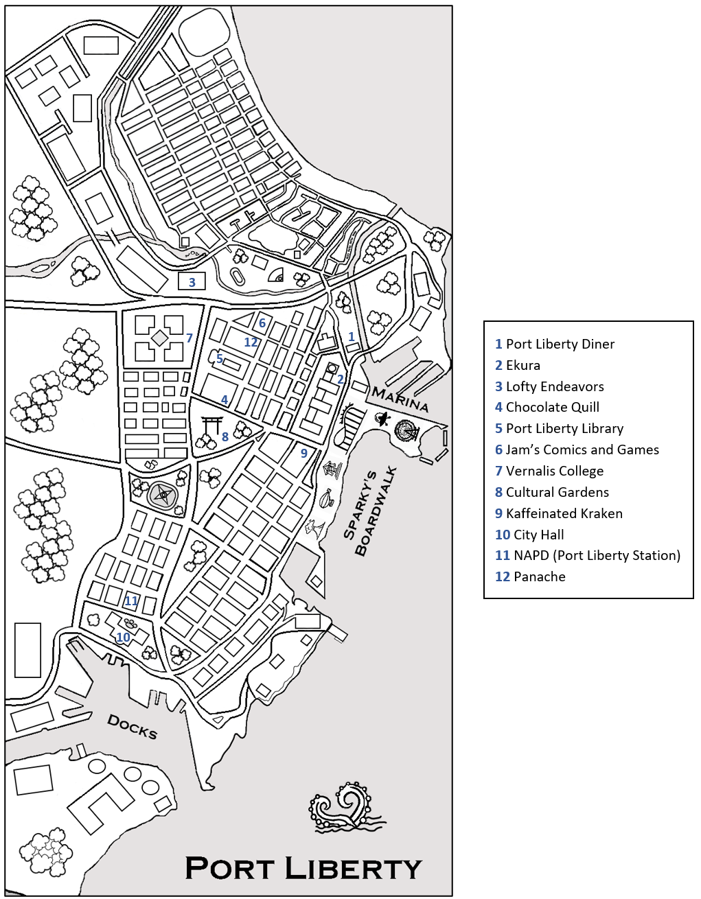 But I kept coming back around to a place in my head that I love: Port Liberty. It’s a quiet suburb, a coastal town with a boardwalk, and oh, did I mention the Giant Squid? Port Liberty is a suburb of New Arete, a superhero metropolis full of capes, villains, and just plain ordinary people trying to get a job done. New Arete is also the home of the pulp action, tail twitching, four fisted hero duo Dorado and Dark Claw (from my short stories in the anthologies Clockwork Oracle and Next Stop on the #13).
